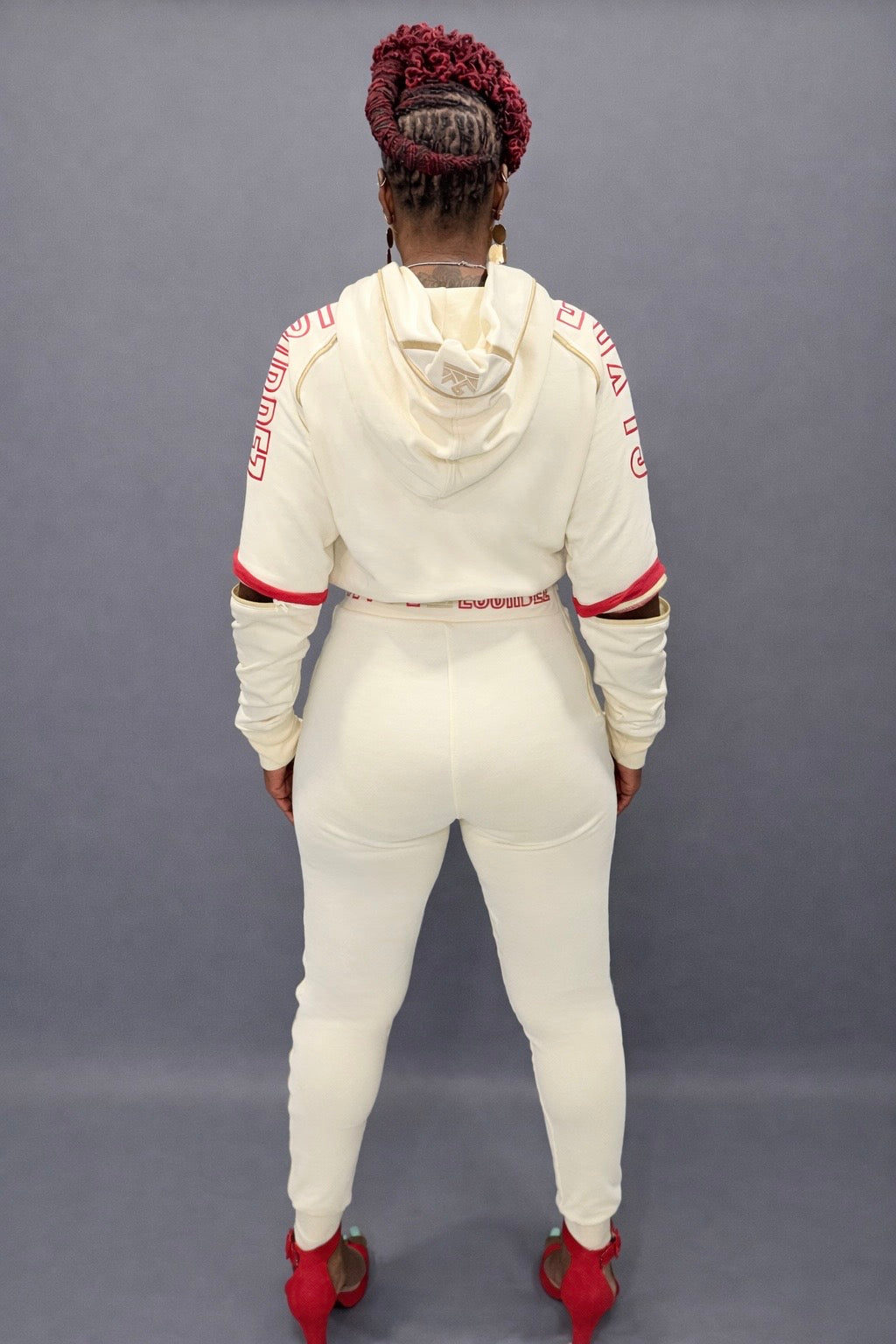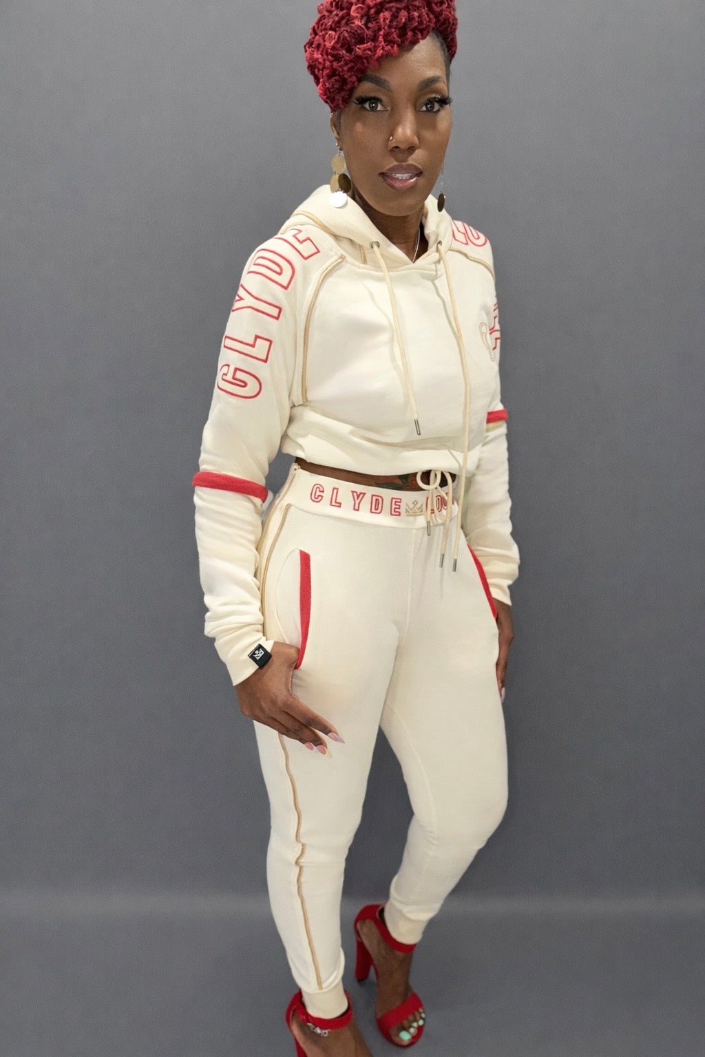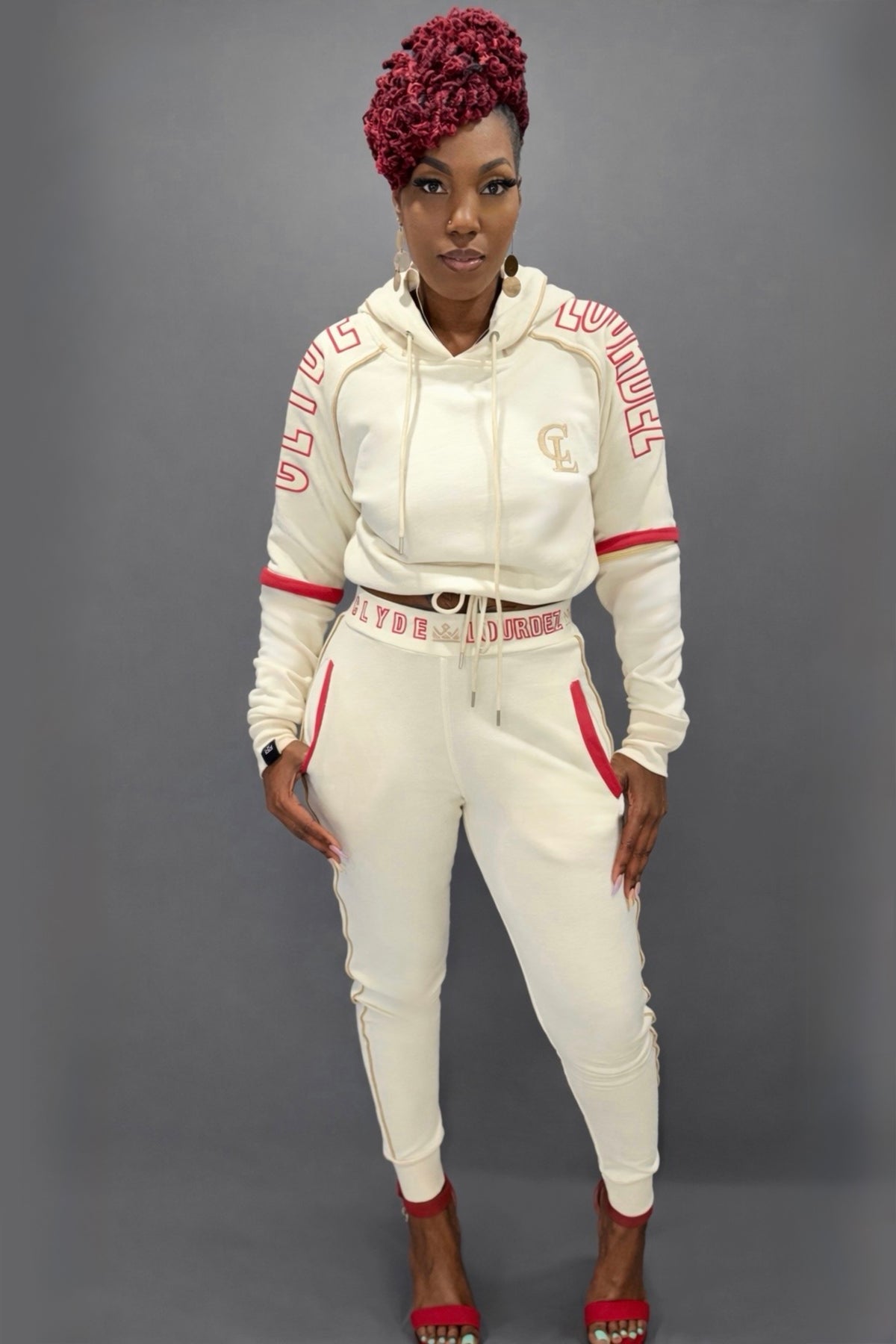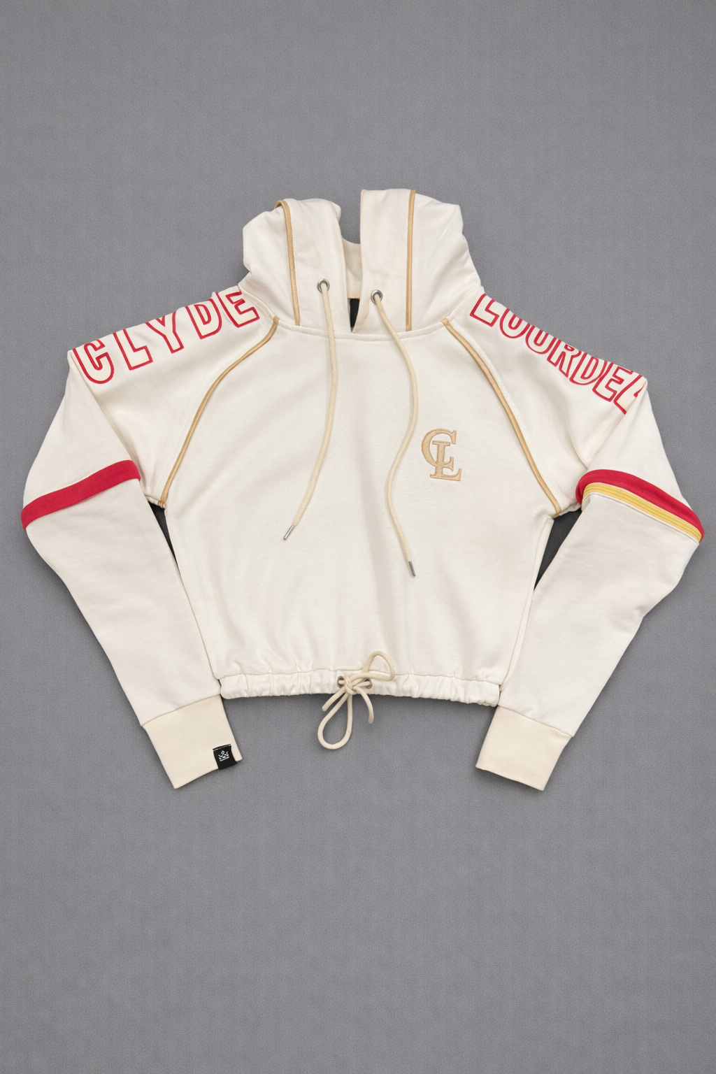 Crafted from soft cotton terry, this hoodie redefines versatility through detail-driven design. Cream Clyde Lourdez appliqué and bold red embroidery sweep across the shoulders, creating a strong visual line that anchors the silhouette with quiet confidence.