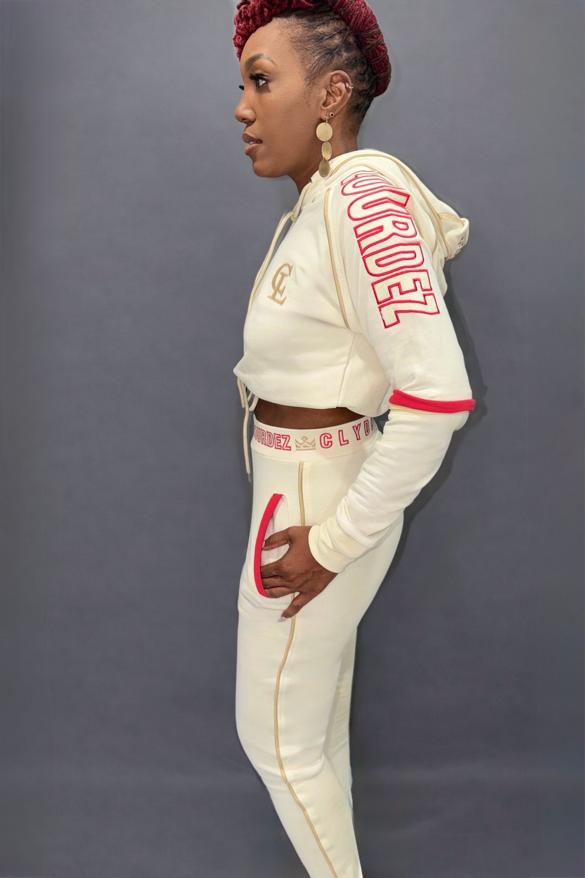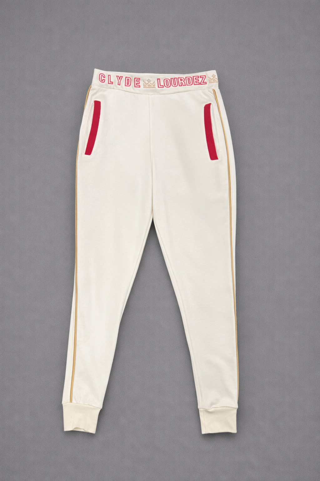 Crafted from soft cotton terry, these joggers balance comfort with elevated detail. A custom Clyde Lourdez waistband wraps the waist with cream appliqué lettering, red embroidery, and embroidered gold crown logos—subtle symbols of distinction, placed with intention.