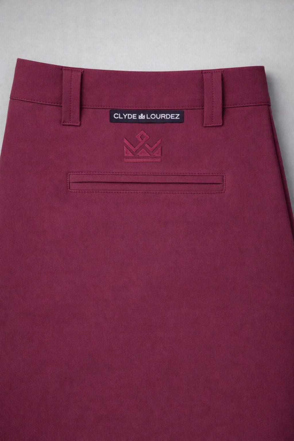 A tonal embroidered crown mark sits beneath the waistband, paired with a discreet Clyde Lourdez label for understated branding.