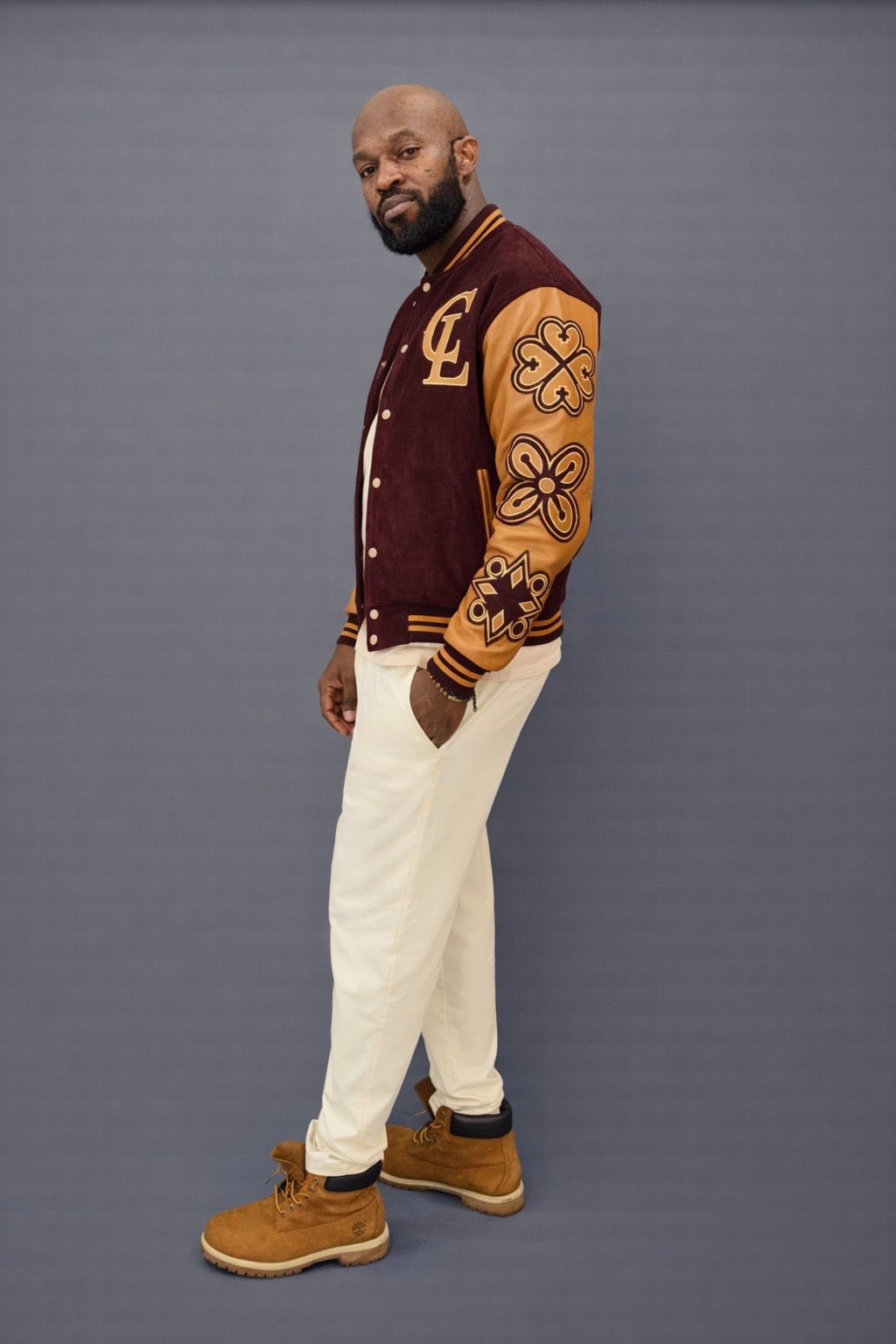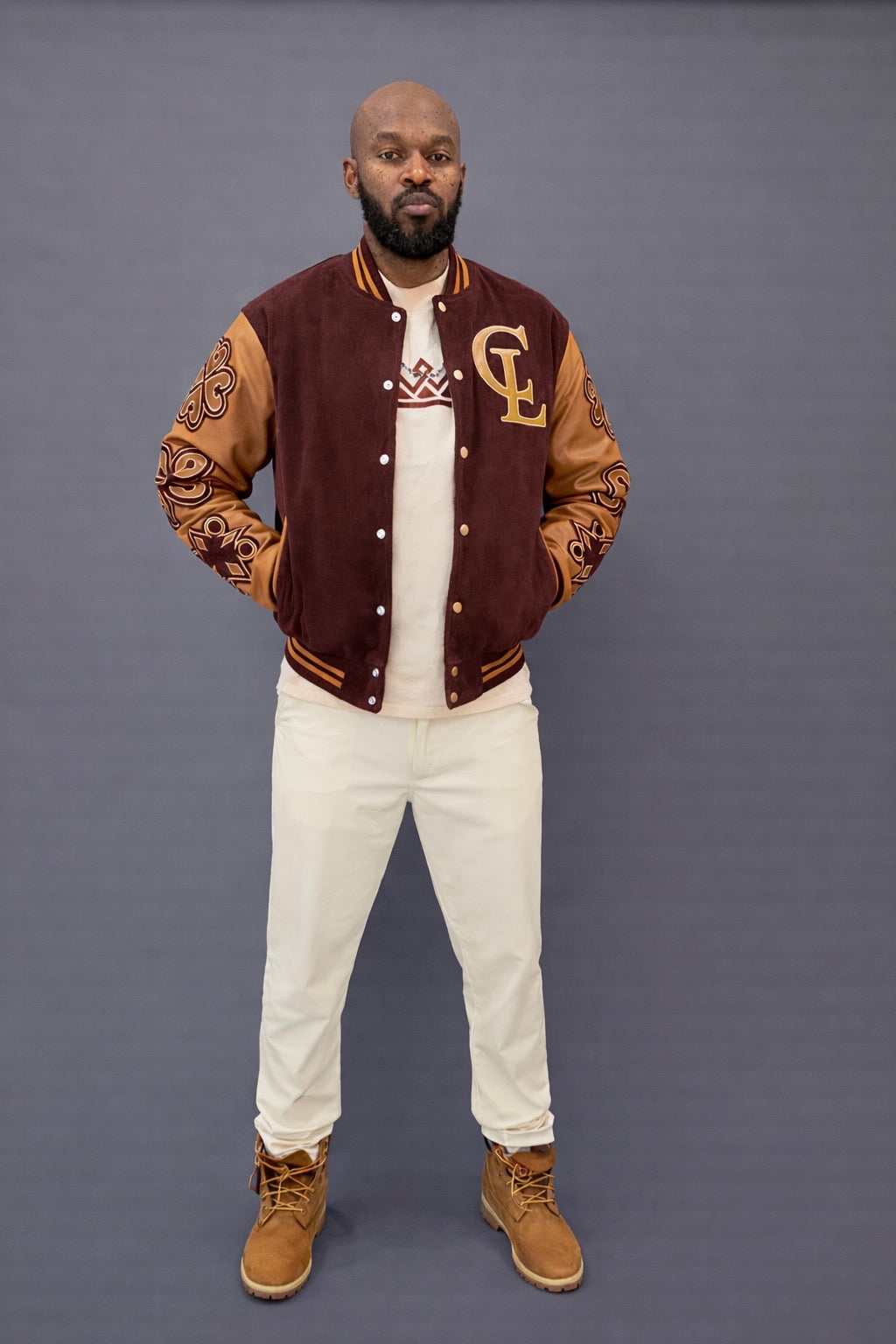 The Staple Adinkra Varsity Jacket is crafted from a premium suede body paired with top grain leather sleeves, combining classic varsity structure with elevated craftsmanship. The contrast between textures creates depth while maintaining a structured, tailored profile.