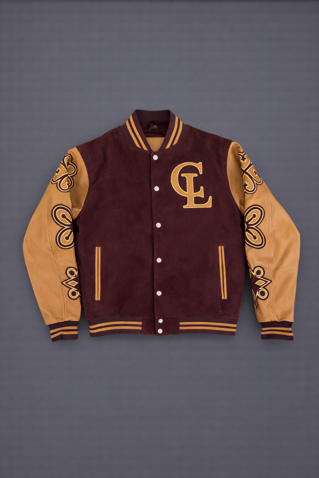 Adinkra symbols run along the sleeves in top grain leather, outlined in suede and finished with golden embroidery — a layered construction that merges cultural symbolism with precision craftsmanship. A gold leather CL monogram anchors the chest, while the back features the crown emblem framed by the embroidered statement: