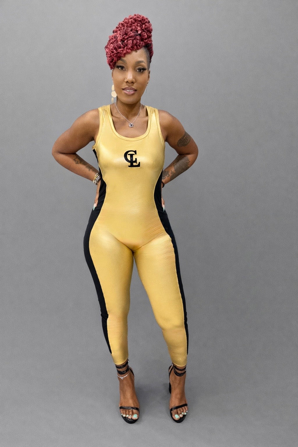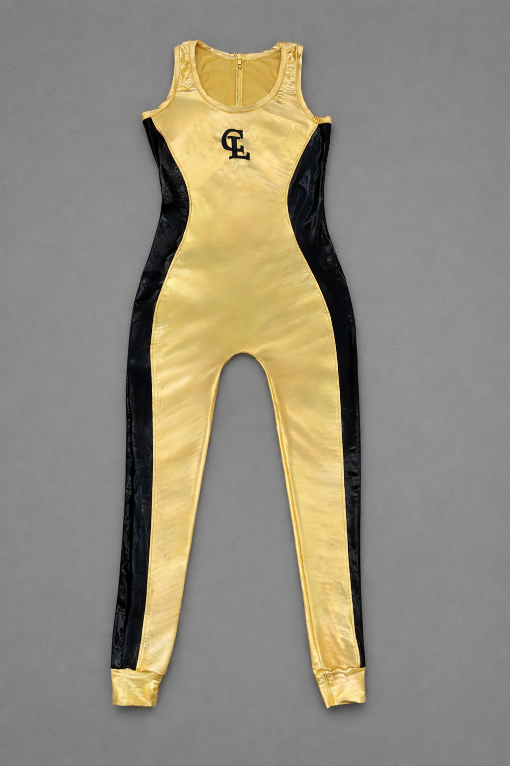 Designed to accentuate the body’s natural curves, the Hourglass Jumpsuit is a sculpted one-piece that commands attention through shape and contrast. The gold body panels contour the frame, while black side panels carve an hourglass silhouette—intentional lines that elongate, define, and flatter from every angle.