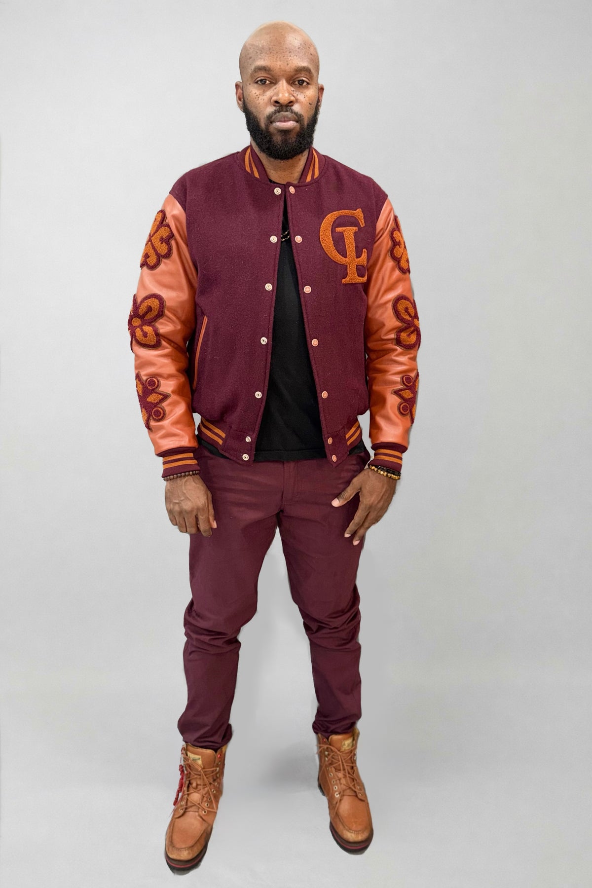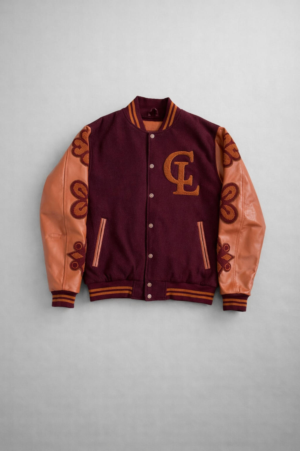 Custom crown snaps, ribbed trim, and a satin interior lining balance weight, comfort, and structure. Designed as a statement staple, this piece blends heritage varsity construction with Clyde Lourdez symbolism.