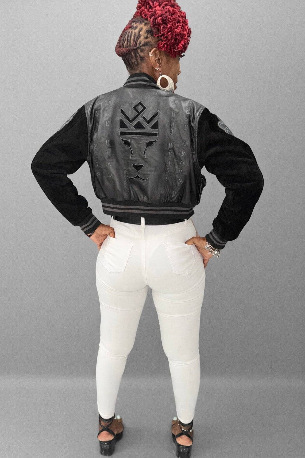Suede branding with complementary embroidery outlining appears on the front and back, while “HEAVY IS THE HEAD THAT WEARS THE CROWN” is embroidered across the back panel—anchoring the jacket’s message and meaning.
